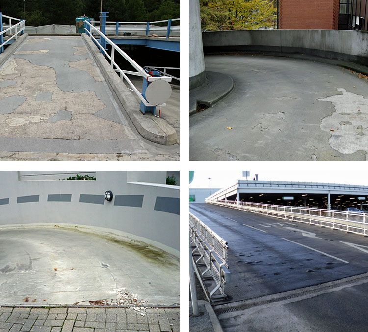 Rampen, Spindeln und Zufahrten sind besonders stark frequentiert, somit sind deren Schrammboards, Fugen und Details besonders gefährdet. Abnutzungserscheinungen werden durch die erhöhte mechanische Beanspruchung vermehrt verursacht und führen zu erhöhtem Abrieb und Spurrinnen. Auf einem überlasteten Fahrbahnbelag mit zunehmend glatten Oberflächen wird zudem die Rutschhemmung beeinträchtigt, was die Sicherheit der Autofahrer zunehmend gefährdet. Eindringende Feuchtigkeit, Verunreinigungen sowie abplatzender Beton können auch hier die Bausubstanz stark schädigen.