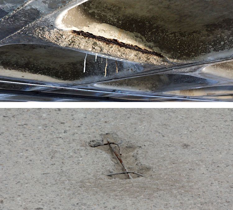 Zum Check gehört auf jeden Fall auch ein Blick nach oben – genauer an die Unterseite des Parkdecks, denn dort werden am häufigsten ersten Anzeichen von Schäden bzw. Feuchtigkeit in der Konstruktion entdeckt. Wenn dort feuchte Stellen und Ausblühungen zu sehen sind, ist das schon kein gutes Zeichen. Sind zudem Abplatzungen vorhanden, ist es Zeit, einen Fachmann zu konsultieren.