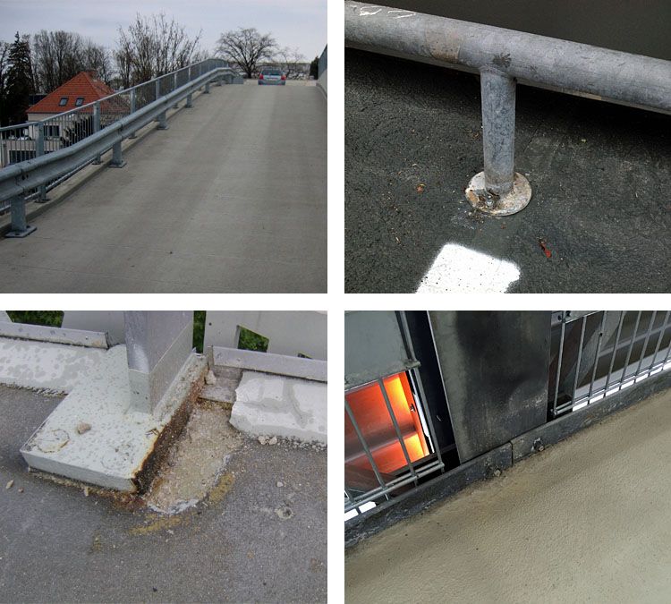 Ist der Belag oder die Unterseite wie in diesen beiden Beispielen schon so beschädigt, dass Teile der Unterkonstruktion, insbesondere aus Metall, zu sehen sind, sollte schleunigst ein Fachmann konsultiert werden. Die Betoninstandsetzung ist dann dringend notwendig, da sonst die Tragfähigkeit des Bauteils gefährdet ist.