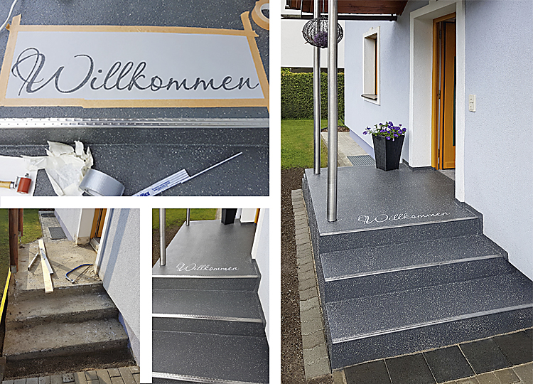 Erhebliche Betonmängel kamen bei Bauarbeiten am Geländer des Eingangsbereichs an einem Straßburger Wohnhaus zum Vorschein. Feuchtigkeit hatte sich ihren Weg durch die Pflastersteine sowie die Splittschicht gebahnt und Schäden verursacht. Eine dauerhaft dichte Konstruktion war gefordert, deren Oberfläche witterungsbeständig, rutschsicher und pflegeleicht ist. Um alle Anforderungen zu erfüllen, setzte die Firma Bauwerk Abdichtung Arnesch (BAA), Straßburg, das Treppen Beschichtungssystem Triflex TSS als Komplettlösung ein. Hoch belastbar, hält es den Einwirkungen von Wetter und Nutzern dauerhaft stand. Zudem bindet das Material auf Basis von Polymethylmethacrylatharz (PMMA) die neuen Säulen des Vordachs zuverlässig ein. Die Fläche lässt sich individuell gestalten, so dass die Verarbeiter gemäß Kundenwunsch den einladenden Schriftzug „Willkommen“ applizieren konnten.