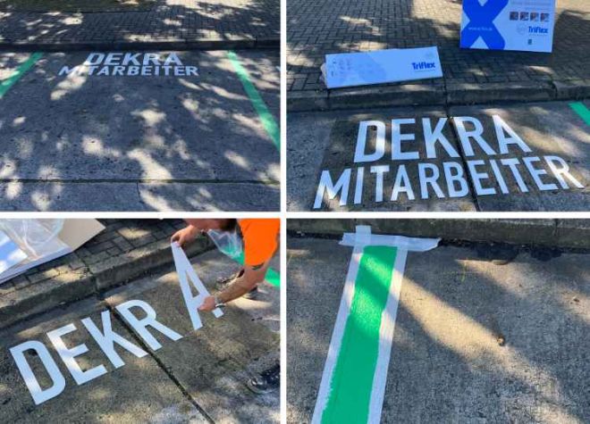 Geplant, geholfen, gelöst. In der DEKRA-Niederlassung im brandenburgischen Finsterwalde sollten die PKW-Stellplätze mit einem Schriftzug gekennzeichnet werden, um diese für die Niederlassungsleitung und die Mitarbeiter freizuhalten. Kunden sollen nicht auf diesen Stellplätzen parken. Als besonders geeignet bot sich für diese Aufgabe das neue Produkt Triflex Line EasyTherm für die Umsetzung an.