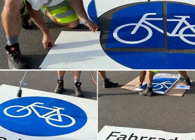 Geplant, geholfen, gelöst. Im baden-württembergischen Kornwestheim sollte eine Fahrbahn unmittelbar vor einer Realschule mit drei Piktogrammen „Fahrradstraße“ markiert werden. Da die Piktogramme bezüglich Form, Farbe und Schriftzug sehr aufwendig sind, wäre eine Umsetzung der Markierung mit Kaltplastik sehr schwierig gewesen, daher hat man sich für unser neues Produkt Triflex Line EasyTherm entschieden. Die Applikation lässt sich mit nur einer Person und wenig Werkzeug schnell und einfach ausführen. Es wird nur ein Besen zur Reinigung der Straße und ein Gasbrenner zum Aufbrennen der vorgefertigten Thermoplastik-Markierung benötigt.