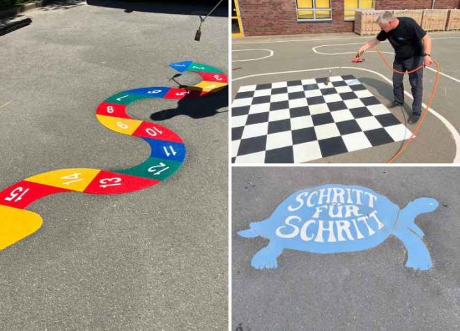 farbintensiven, langlebigen Markierungssysteme von Triflex wurde das gesamte Außengelände funktional, sicher und kinderfreundlich
