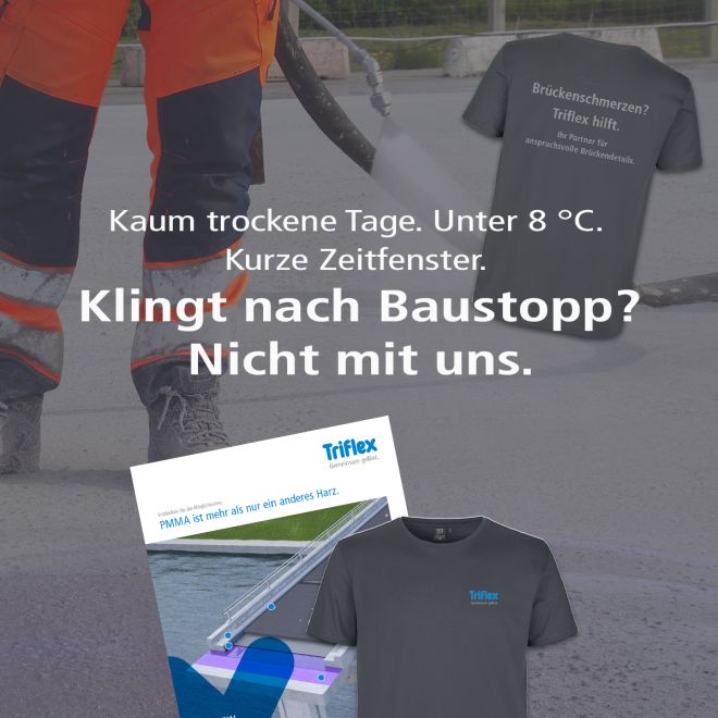 Die Abdichtung von Brücken ist ein entscheidender Faktor für ihre Langlebigkeit und Sicherheit. Mit der innovativen maschinellen Applikation von PMMA-Abdichtungssystemen setzt Triflex neue Maßstäbe in der Brückensanierung. Das Verfahren ermöglicht eine präzise und gleichmäßige Beschichtung großer Flächen in kürzester Zeit – ein entscheidender Vorteil für Baukostenoptimierung und eine effiziente Brückeninstandhaltung.